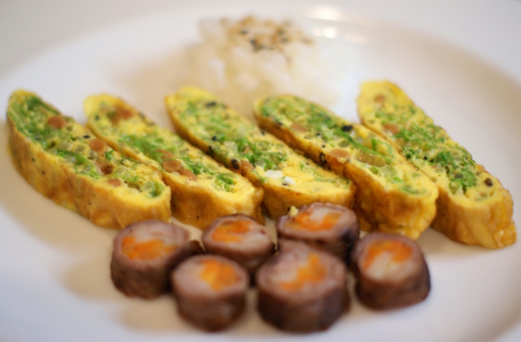 水菜と納豆と胡麻入り玉子焼きと牛肉ロール。
