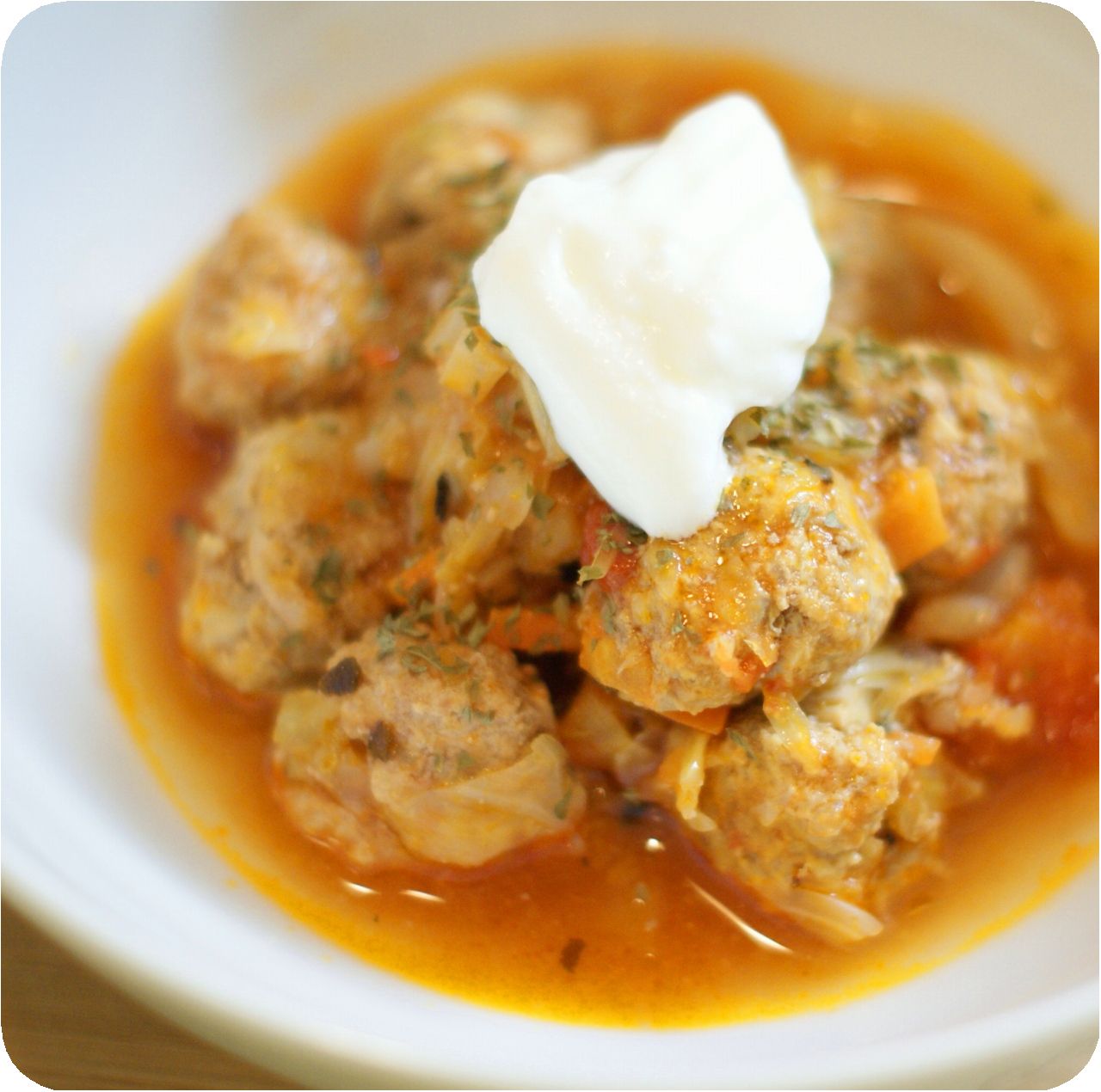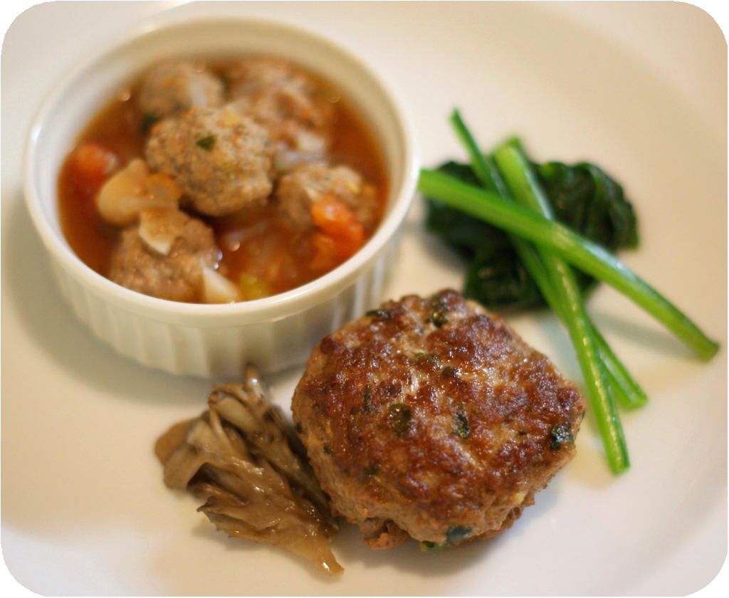 ハンバーグと、ミートボールとヒヨコ豆のトマトスープ。